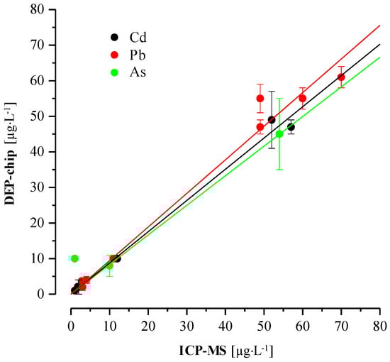 To demonstrate the on-field application for heavy metal ion determination in real drinking groundwater samples, we conducted field experiments to evaluate the on-site rapid detection ability of our DEP-On-Go platform. Some typical heavy metals, including lead, cadmium, and arsenic, are the most alarming contaminants in the groundwater in the northeastern parts of India [,]. Several groundwater samples were collected from rural and urban areas in the northeastern parts of India and they were directly measured by our device. As shown in Table 2, we detected high amounts of lead, i.e., near six times above the permissible limit, from the northern parts of India and verified the ability of our device for early warning of heavy metal toxicity in polluted residential areas. In order to validate the DEP chip-based electrochemical detection method, the results were compared with those obtained by inductively-coupled plasma mass spectrometry (ICP-MS). As shown in Table 2, the concentrations of lead, cadmium, and arsenic determined by the DEP chip were very close to those determined using the ICP-MS method, and they showed a linear correlation curve with a correlation coefficient ranging from 0.995 to 0.978 (Figure 5). These proof-of-principle experiments and the comparative study suggest that our DEP chip-based platform has promising possibilities for practical applications. We believe that the “DEP-On-Go” device is highly desirable for the rapid initial screening of environmental samples and is, thus, anticipated as a heavy metal surveillance method in healthcare management for providing the early alarming signs of heavy metal toxicity.