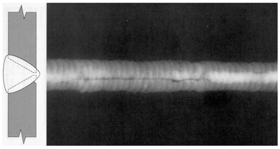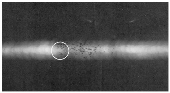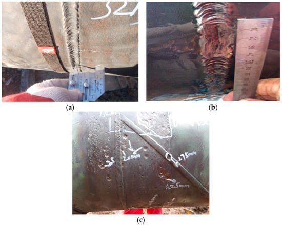 Volumetric defects include porosity, slag inclusion, underfill, bevel grinding and weld corrosion, etc. Porosity is air pores formed when the air generated in the process of welding fails to escape but remains inside weld metal. Slag inclusion occurs when the slag of welding flux fails to float out of the weld pool and is trapped in the weld pool during the melting–cooling process. Porosity and slag inclusion often occur inside weld metal. Figure 3 presents the profile of weld porosity during X-ray inspection. Underfill, bevel grinding and weld corrosion is caused by the lack of girth weld metal, and their typical profiles are shown in Figure 4.