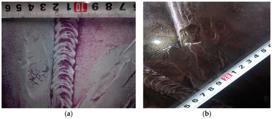 Irregular shape defects contain an irregular weld outline, and mismatched weld joint, etc. A mismatched weld joint means that the two edges of the pipeline are mismatched during welding (as shown in Figure 5); this could reduce effective wall thickness, which may cause extra bending stress. Irregular weld outline is easily caused by construction and other factors, e.g., difficult welding for girth weld at the bottom of the pipeline.