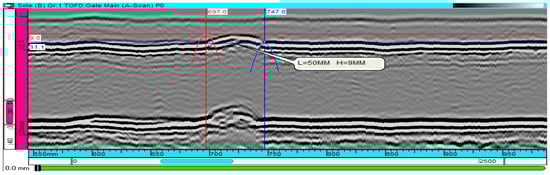 Ultrasonic inspection is presently an important nondestructive testing technology for pipeline girth weld defect inspection. Ultrasonic waves could be scattered by planar and volumetric defects, and the echo signals from defects can be utilized to identify two such types of defects, measure the dimension and depth of defects and judge the nature of defects. Regular ultrasonic manual or fully-auto inspection has been widely applied in the detection of pipeline weld imperfections. Along with the increasing requirements for the ability to inspect the small weld defects, some advanced ultrasonic inspection technologies have been developed, such as phased array ultrasonic inspection [6] and time of flight diffraction technique (TOFD) [7]. Among them, TOFD utilizes a pair of transmitter and receiver probes arranged at both sides of weld, and employs the tilted wedge for the generation of a longitudinal wave. Following the principle of wave diffraction, it can ideally realize the detection and sizing of weld defects without being affected by factors such as sound beam angle, detection direction, and surface roughness of the defect [7]. TOFD does not rely on the reflective energy of the defect to identify it, which is an innate weakness of regular ultrasonic inspection, so it has a wide application prospect in pipeline girth weld defect inspection. Figure 7 presents the inspection of girth weld defects through TOFD after excavation of the pipeline, which reveals the linear defect at the root of the weld.