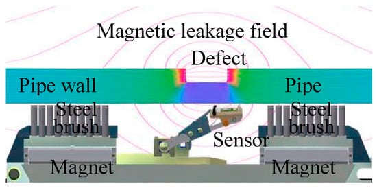 Schematic diagram of the magnetic flux leakage in-line inspection principle.