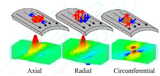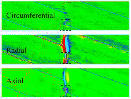 The axial magnetic leakage field component of a metal loss defect is a typical uni-polar waveform, and its amplitude is highly related to defect depth, but the axial signal has nonlinear change in the directions of width and length, so the length and width of defects can only be estimated based on the range of signal deformation, causing very low accuracy and reliability. The radial signal component shows bipolar sine waveform with equal amplitude of peak and trough, which is highly correlated with defect depth. The gap between peak and trough can greatly reflect the length of the defect. The circumferential signal shows the positive and negative polarities in both radial and circumferential directions, and visually reflects the width and length of the defect (Figure 9). This technology can effectively detect and size the defects of long-distance transport pipelines, such as metal loss (corrosion and mechanical scratch) [12,13,14,15,16]. Additionally, PetroChina Pipeline Company (Langfang, China) has, through cooperation with GE Oil & Gas Pipeline-inline-inspection Solutions (GE PII, Newcastle, UK), applied the three-axis high-resolution MFL technology in the inspection and sizing of volumetric defects in the spiral weld of long-distance transport pipelines, so as to successfully eliminate the problem of spiral weld cracking of the aged pipes in Northeast China [17,18,19,20]. It is important to note that inspection is very difficult due to the dramatic decrease of magnetic flux leakage outside the pipe wall, along with the increase of wall thickness and inspection speed [21].