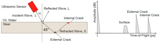 Ultrasonic crack inspection equipment can identify tiny cracks [47,48], stress corrosion cracks [49] and fatigue cracks [50], etc. This technology has very high accuracy of inspection with regard to crack defects, but it must rely on the coupling between liquid medium and pipe wall, so it is difficult to apply it in the gas pipeline.