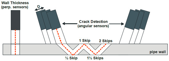 At present, this technology has not been applied in the practical girth weld defect inspection of pipelines in other countries. Through cooperation with GE PII, PetroChina Pipeline Company (Langfang, China) has carried out a series of studies [51] and improved the applicability of equipment to circumferential defects by resetting the direction of sensors. The inspection for circumferential crack defects of girth weld has a different configuration of sensor carrier and data recognition from traditional axial crack inspection. Sensors can be divided into upstream and downstream directions. In addition, each track is equipped with two perpendicular ultrasonic sensors to measure the wall thickness and identify characteristic location. External cracks can be identified by half or one-and-a-half skip reflection, while internal cracks depend on one or two skips for identification, as shown in Figure 12.