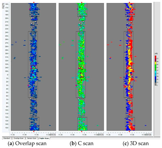 During identification, the girth weld defect is comprehensively analyzed based on the signals of C-scan view, overlap view, and 3D view (Figure 13). Figure 13a is an overlap view, which represents all recorded readings at the same position and stands for the number of sensors recognizing the characteristic. Figure 13b is a C scan view, representing the strength of the reflected signal. The higher the strength of the reflected signal, the darker the color is. Figure 13c is a 3D view, in which the blue area stands for the upstream edge of the weld detected by the upstream sensor (blue), and the red area is the downstream edge of the weld detected by the downstream sensor (red). The yellow area is the center of the weld, where upstream and downstream sensors coincide. If the position of color (red or blue) in the signal is different from the normal weld characteristic, there may be some abnormalities. Generally, if there is any abnormality at the same position in the C scan view, overlap view and 3D view, the position is recognized as the linear defect characteristic.