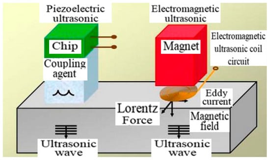 Common ultrasonic and electromagnetic ultrasonic technology share many similarities (Figure 14) except that the generation is achieved by piezoelectric chip or electromagnetic induction. Electromagnetic ultrasonic technology utilizes the electromagnetic effect to generate an ultrasonic signal in the inspected metal pipe, which does not need a coupling agent due to direct contact, so it can directly inspect the pipeline with the settled layer or protective layer on the surface [62]. However, the electromagnetic ultrasonic signal has lower amplitude and higher sensitivity to the noise in the surroundings [63,64].