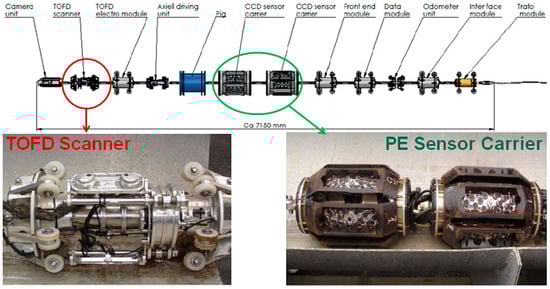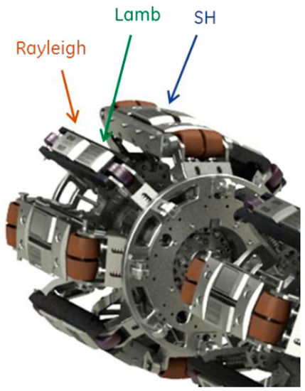 TransCanada, a Canadian company, started an attempt associated with PII to apply the EMAT technology in pipeline inspection equipment [65], and employed the EMAT sensors to generate the shear horizontal wave (SH wave), surface wave (RH wave) and Lamb wave for measurement (Figure 15). The SH wave is a horizontal polarization shear wave, which travels inside the pipe wall and can be used to detect any crack and size the crack depth. The SH wave has some special advantages. When it is reflected at the boundary, the reflected wave does not cause the conversion of waveform, but contains only the SH wave. When it is used in measurement, the signal analysis is simplified. The surface wave (RH wave) travels only in the inner surface of the pipe wall and can be used to identify the defects of inner and outer surfaces. The Lamb wave transmits into the pipe wall directly, and travels circumferentially inside the pipe, so it can be used to measure the wall thickness of the pipe, and distinguish cracks from no damage. Now, this technology has been proved to be effective to detect the stress corrosion crack and longitudinal weld crack of gas pipelines [66,67,68]. GE PII and Rosen have developed the mature in-line inspection equipment [69,70], and some Chinese universities have been engaging in studies on the technology and equipment of EMAT inspection for pipeline defect, including Tianjin University [71], Shenyang University of Technology [72,73], Beijing University of Chemical Technology [74] and Tsinghua University [63].