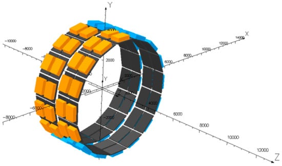 The inspection of a girth weld crack is similar to that of a longitudinal weld crack, but it is relatively more difficult to inspect the circumferential crack. PetroChina Pipeline Company and PII carried out the feasibility study on the EMAT inspection technology and equipment for pipeline girth weld defects, and employed the axially arranged EMAT converter based on the characteristics of a pipeline girth weld defect [75]. To guarantee the full circumferential coverage of pipeline girth weld, pairs of EMAT converters are distributed along the circumference (Figure 16) to solve the problem of potential noise caused by the number of collection channels and the crosstalk between converters. Moreover, sufficient counts per revolution must be realized, and a minimum crack length of the inspected object is utilized to optimize the width of the EMAT converters.