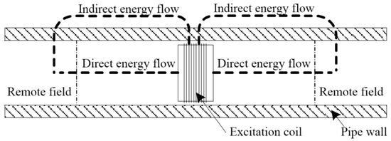 Electromagnetic eddy current in-line inspection technology can effectively receive the magnetic field that passes the tube wall and returns to the inside tube by employing the excitation coil or placing a measurement coil with a certain distance from the excitation coil, so as to effectively detect the interior wall defect of the metal tube. The inspection principle is as shown in Figure 17 [86]. The inspection coil of RFEC is located in the “remote field area” with a distance equivalent to 2~3 times of the tube’s inside diameter from the excitation coil. In this area, the amplitude and phase of the electromagnetic eddy current signal decrease at a very low speed, which is the same inside and outside the tube. The phase delay of induced electric potential is roughly directly proportional to the thickness of the tube wall that it passes through, and it can be calculated approximately by employing the phase formula for the one-dimensional skin effect for calculation [87].