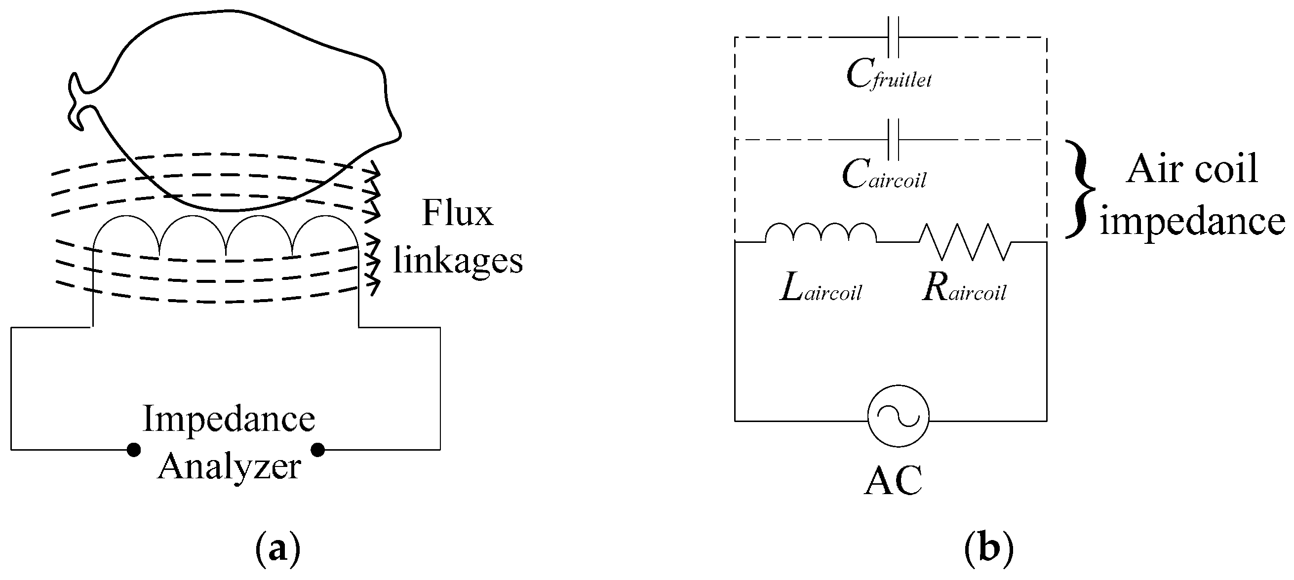 The single flat-type coil representation is shown in Figure 1a. The flux linkages flow through the fruit sample and the inductance of the air coil is measured by using an impedance analyzer. The whole system of the inductive oil palm fruit sensor can be further explained as illustrated in Figure 1b. This inductive oil palm fruit sensor requires operating at the high-frequency response and thus the effect of inductance is very high. The value of the capacitance is predicted from the value of the stray capacitance which came from both the air coil and fruitlet samples.
