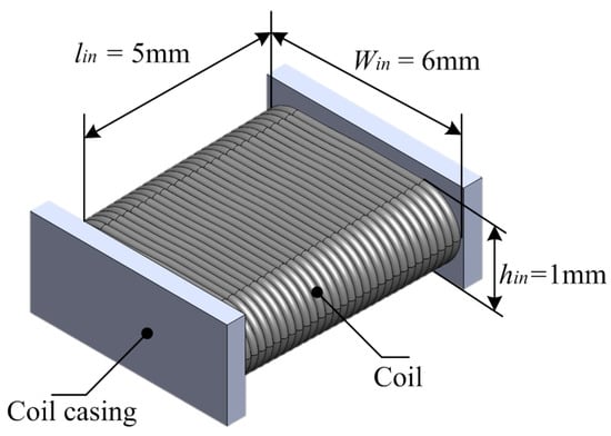 The inductance value is calculated with Equation (2). The value of the Nagaoka coefficient, Cnagaoka, is 0.642941286 as acquired by Equation (4) together with Equations (5)–(9). The value of the ideal coil L0, obtained from Equation (3), is 213.7 μH. Therefore, the estimated inductance of the flat-type air coil Laircoil is 137.4 μH.