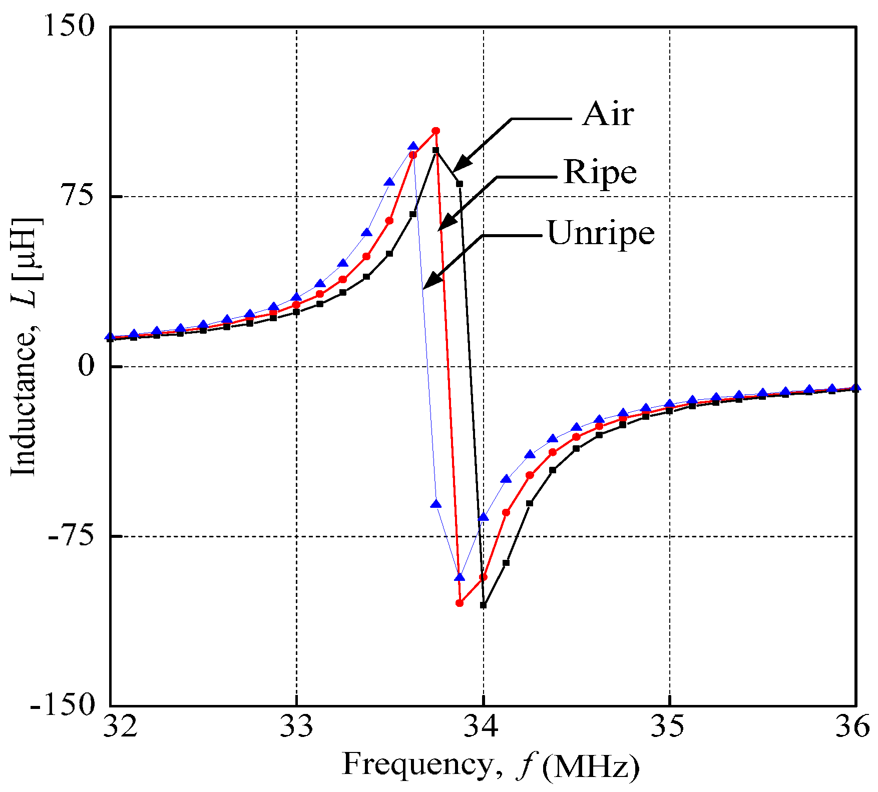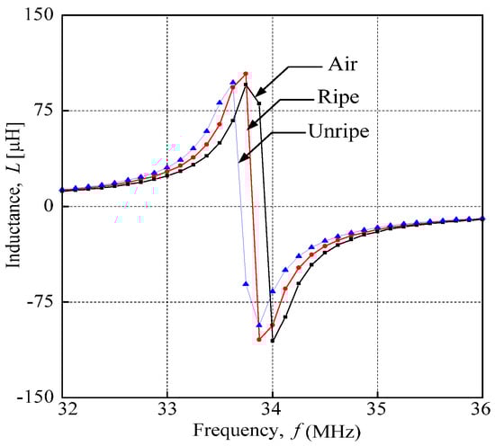 Through analyzing the inductance characteristics for air, and ripe and unripe fruitlets, the graph shows different resonance frequency values with similar curves for all samples. The resonance frequency from this experiment is identified where the inductance is at its maximum value. From Figure 4, the inductance characteristics of each sample are represented by colors; that is, the black line represents air, the red line represents ripe fruit and the blue line represents unripe fruit. The sensor portrays a similar inductance characteristic curve for all samples throughout the experiments.