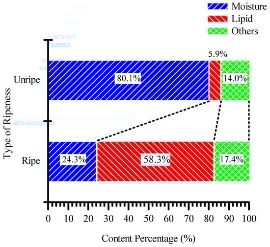 Therefore, from the approximate moisture content of the unripe fruitlet curve, the unripe fruitlet with an 80.1% moisture content, from data in Figure 5, falls near Week 3, and the ripe fruitlet with a 24.3% moisture content falls near Week 18, as shown in Figure 8.