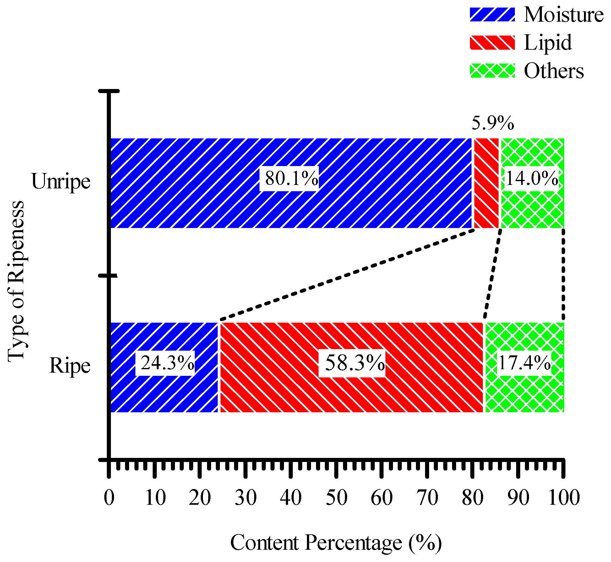 The percentage of content for unripe and ripe oil palm fruit.
