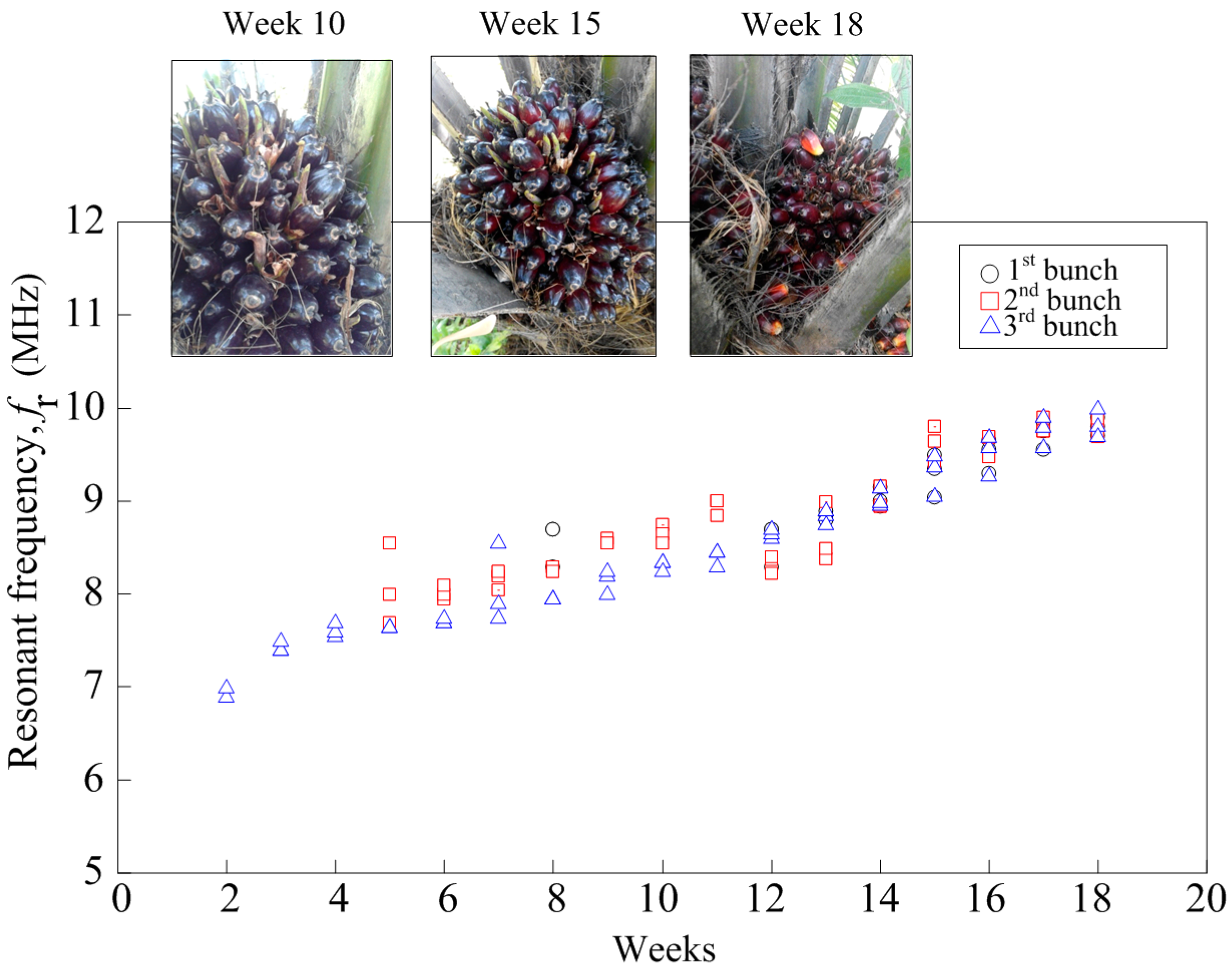 Figure 7 shows the results from three bunches of the oil palm FFB at different levels of maturity according to the number of weeks. All graphs show a similar curve where the resonant frequency increases as the week of the testing increase. The field test was conducted simultaneously on three different fruit bunches until they fully ripened. The number of weeks it took for each bunch to reach its optimum maturity differed for each bunch, as these bunches were initially at different stages of ripeness. From Figure 7, the blue-colored symbol represents the bunch that was predicted to be at eight weeks of anthesis when the field testing started and it ended after 10 weeks as the fruitlet started to loosen from the bunch. The red-colored symbol represents the bunch predicted to be at the age of four weeks of anthesis while the black-colored symbol represents the bunch at two weeks of anthesis. All three bunches provided a similar pattern throughout the testing period and the range of the resonant frequencies for all these bunches was recorded within 6.3 MHz to 9.9 MHz.