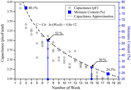 Based on the measured resonance frequency obtained, a graph of capacitance and moisture content against the week is plotted and the significance of the relationship is modeled. An approximation line is plotted and the relation between the moisture content is approximated between the number of weeks and the capacitance. The capacitance values are obtained with Equation (1) using Laircoil = 137.4 μH as calculated from Equation (2) and the resonance frequency obtained through field measurement. It is observed that as the number of weeks progressed, the capacitance value obtained through the measured resonance decreased. This is due to the loss of moisture in the fruitlet and the increase in lipid content as the fruitlet in the fruit bunches ripened. Referring to the data obtained from Figure 5, the percentage of moisture content for unripe and ripe oil palm fruitlets is marked near the approximation line as shown in Figure 8.