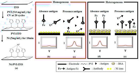 In this work, a homogeneous method was used for detecting HA. The mechanisms of the homogeneous and heterogeneous methods are presented in Figure 1b–e. The feasibility of the HA immunoassay was investigated according to the following two steps. (1) Fe-HA antigen sample (40 μL, 0.05 mM) was mixed with various concentrations of anti-HA, and placed into a microtube for 20 min at room temperature; and (2) CV data were collected from −0.5 to 1.0 V versus Ag/AgCl with a scan rate of 0.1 V/s, and plotted as the electrochemical immunosensor signal. The competitive immunoassay of HA was carried out as follows; (1) Fe-HA antigen (40 μL, 0.05 mM) and anti-HA (40 μL, 0.6 mg/mL) were mixed with either HA solution or human urine matrix in the microtube, and incubated for 20 min at room temperature; and (2) afterwards, the mixed solution was measured electrochemically by DPV on the Ni-PVI-ITO electrode from −0.2 to 0.8 V versus Ag/AgCl, with a pulse amplitude of 0.05 V and a pulse width of 50 ms. A spike test of HA in a urine sample was also performed to demonstrate the feasibility of our method in the presence of a human urine matrix. In the spike test, the electrochemical immunoassay was conducted with mixed urine solutions (40 μL) containing Fe-HA antigen (0.05 mM) and spiked HA in the range of 0.001 to 1.0 mg/mL in human urine. All baselines of CV and DPV were corrected by the CHI 660B software.
