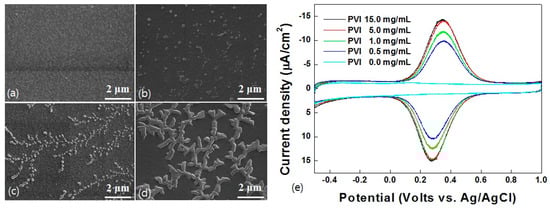 FE-SEM images (×30 K) on (a) bare ITO electrode and electro-polymerized ITO electrode with PVI concentrations of (b) 0.5 mg/mL; (c) 1.0 mg/mL; and (d) 5.0 mg/mL. (e) Cyclic voltammograms of Fe-HA (50 μM) based on Ni-PVI-ITO electrode which PVI concentrations of 0.0, 0.5, 1.0, 5.0, and 15.0 mg/mL.