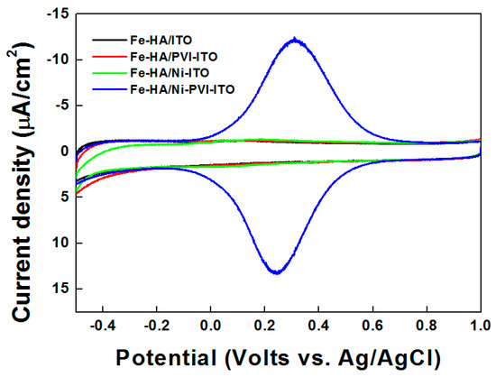 The cyclic voltammograms of Fe-HA reacted on ITO (black line), PVI-ITO (red line), Ni-ITO (green line), and Ni-PVI-ITO (blue line) electrodes are shown in Figure 3. Reversible redox behavior of the reacted Fe-HA was only observed on the Ni-PVI-ITO electrode (blue line), with a peak separation (ΔE) of 60 mV occurred at 0.1 V/s scan rate. No Fe-HA peaks were observed in the other samples, indicating that the immobilized Ni(II) ions are necessary for reaction with the cyanide groups of Fe-HA [2,3]. In other words, Ni(II) ions cannot modify ITO electrode without PVI. Finally, Fe-HA cannot bind to the ITO electrode without any substrates such as PVI and Ni(II) ions.