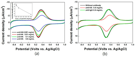Cyclic voltammograms of Fe-HA (50 μM) reacted Ni-PVI-ITO electrode with (a) anti-HA (concentration range of 0.001 mg/mL (black line), 0.01 mg/mL (red line), 0.1 mg/mL (green line), and 0.6 mg/mL (blue line)) and (b) anti-IgG for 10 min. Inset: concentration curve of anti-HA at CV of 0.35 V.