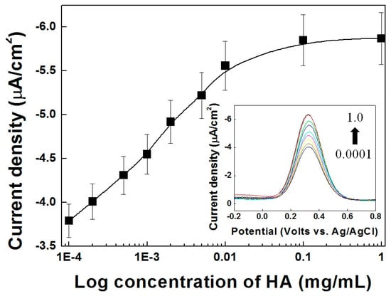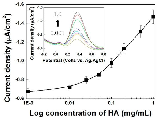 The calibration curves for the HA electrical immunoassay with increasing HA antigen concentration are presented in Figure 5. Both free HA and Fe-HA can bind to anti-HA, therefore the competitive immunoassay with Fe-HA showed typical DPV curves from low to high HA concentration (inset of Figure 5). As mentioned above, the binding to the large anti-HA molecule obstructs the migration of Fe-HA the solution to the Ni-PVI-ITO electrode. In addition, it has been reported that the small Fe-HA antigen is more competitive than the linked one [35]. As shown in Figure 5, the magnitude of the anodic current (ip,a) at 0.35 V versus Ag/AgCl was chosen to represent the concentration of HA. The value of ip,a was found to be proportional to the HA concentration in the log scale detection range of 0.0001 to 0.01 mg/mL, with a limit of detection (LOD) of 4.15 μA (n = 4 is the number of different electrodes used). Since the cutoff concentration of HA in human urine samples is 2.0 mg/mL, this electrochemical immunoassay is sufficient for detecting HA in clinical diagnosis [19].