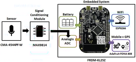 Suggested hardware platform. This is based on the FRDM-KL25Z embedded system. The microphone is the CMA-4544PF-W capsule followed by the MAX9814 amplifier. The platform also provides GPS, WiFi and mobile communications modules.