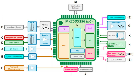 Block diagram of the MUlti-SEnsor array (MUSE) system composed of the following functional modules: A—pH sensor; B—impedance sensor; C—temperature sensor; D—stress sensor; E—cyclic voltammetry module; F—transient voltage analysis module; G—electrical stimulator; H—Cactus Semiconductor CSI021 (Cactus Semiconductor, Chandler, AZ, USA) stimulator (secondary stimulator); I—power monitoring to monitor the system; J—intelligent power routing to reduce power consumption; K—data storage (SD card); L—microcontroller and M—application software to control the system.