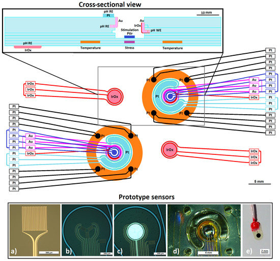Conceptual sketch of the dual multi-sensor array configuration. A cross-sectional view of the array is shown (top). It depicts a PtIr stimulation electrode (blue) positioned above a stress strain gauge (purple) as well as surrounded by an IrOx sputtered on gold pH working electrode (WE) (red), an Au (pink) and Pt (turquoise) reference pH electrode (RE) and four Pt impedance electrodes (black). The temperature strain gauge (orange) is positioned around the electrodes and is prototyped with the strain gauge shown in (a) [17,19]. The PtIr stimulation electrode is positioned directly above the stress strain gauge depicted in prototype (b,c) [20]. Prototype (d) shows a picture of the prototype multi-sensor array with the four Pt impedance electrodes surrounding the pH and stimulation electrodes. The pH electrodes allow a differential measurement to be made between the working electrode (IrOx) and reference electrodes (Au electrode, semilunar shaped Pt electrode and more distant IrOx for pH measurement of the surrounding medium, intended to be insensitive to stimulation) while stimulating via the PtIr electrode is performed. The pH sensor used to verify the pH electronics is shown in (e).
