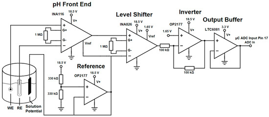This single supply IC allows a differential voltage to be measured without defining one of the pH electrodes to a fixed voltage such as ground. Additionally, the IC has integrated guard rails to reduce input leakage currents into the amplifier. For this application, the guard rails were connected from the amplifier inputs down to the physical sensor. The front end of the pH readout system (see Figure 3) was comprised of the ultra-low input bias current amplifier INA116 with a defined high voltage mid supply reference voltage provided by an OP2177 (Analog Devices, Norwood, MA, USA) reference operational amplifier. The signal chain was completed by level shifting the pH signal from a bias around the full voltage mid-supply (9.25 V) to a low voltage mid-supply (1.65 V), allowing the signal to be scaled down, inverted and buffered to a range from which it can be recorded with an Analog-To-Digital converter (ADC) integrated in the microcontroller. The final buffer ensured that the input was limited to 3.3 V to not exceed the ADC input voltage.