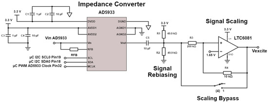 Circuit schematic of the AD5933 impedance analysis chip and signal scaling stage.