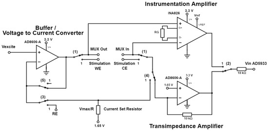 The proposed circuit was designed to provide basic potentiostatic measurements in a two or three electrode setup. Alternatively, the setup also allows galvanostatic measurements to be made with a two or three electrode setup (implemented in Figure 5). The state of the excitation mode can be selected using switches (1)–(5), as shown in Table 3. Switch (1) sets the excitation signal across the stimulation working and counter electrode or across the multiplexed electrodes (Figure 6).
