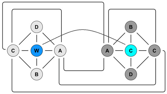 Possible impedance measurements for two multi-sensor arrays. Shown on the left is the working multi-sensor array with four impedance electrodes (A–D) located around the stimulation electrode (W). On the right is the counter multi-sensor array likewise with four impedance electrodes (A–D) located around the stimulation counter electrode (C). Each connecting line represents a possible impedance measurement option.