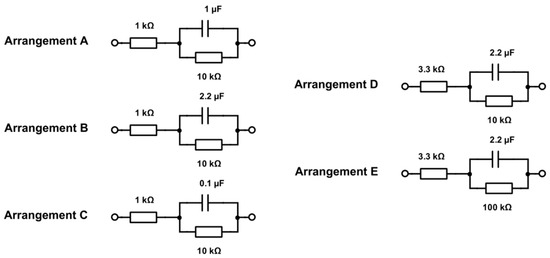As a validation of the AD5933 impedance system, the impedance spectroscopy of an arrangement of five equivalent electrode models composed of a resistor in series to a resistor in parallel to a capacitor (Figure 8) was recorded using the two-point measurement and compared to a commercially available potentiostat/galvanostat (Metrohm Autolab PGSTAT302N, Utrecht, The Netherlands) with an embedded impedance spectroscopy module. As a final validation of the system, a 0.85 mm diameter platinum electrode, produced identically to the prototype impedance electrodes (Figure 2d), was characterized in a three-electrode setup.