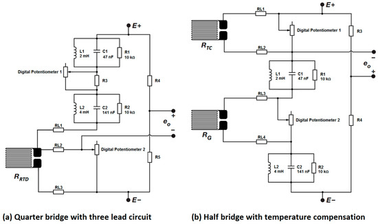 Two modified Wheatstone bridge arrangements were designed for the temperature and stress sensors (Figure 9). The modification to the standard Wheatstone bridge arrangement allows balancing of the sensor bridge to the reference bridge, thus ensuring the Wheatstone bridge remains within its linear range. Since the sensors will be exposed to a fluid medium and will have potentially lengthy lead wires, both the temperature and stress sensors are expected to develop stray capacitances, which even at picofarad ranges, are enough to imbalance the sensor bridge and saturate the amplified output signal. The circuit allows the resistive component of the bridge to be rebalanced using digital potentiometers 1 and 2, while the two RCL arrangements provide a means of matching the reactive components of the bridge by allowing the system to be calibrated using the excitation frequency.