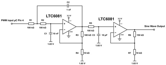 The sinusoidal excitation signal for the Wheatstone bridges was generated by passing a Pulse Width Modulation (PWM) signal from the microcontroller through a second-order Sallen-Key low-pass filter (Figure 10) [26]. The microcontroller PWM allows for single Hertz resolution and phase correction between the two bridges to within a hundredth of a degree. Phase correction to be controlled by changing the PWM frequency provides a faster calibration compared to just using a standard all-pass filter, which would require a digital potentiometer to be programmed for each correction.