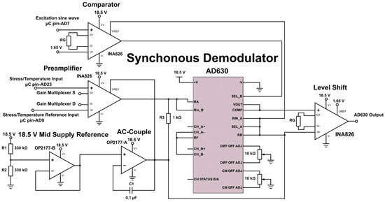 AC coupling was provided for the preamplifier by using the feedback network of R3, C1 and an OP2177 (Analog Devices) operational amplifier (Figure 12), which was biased at the high level mid-supply voltage (9.25 V) using another OP2177. This coupling reduced input referred noise with frequencies below the high-pass cut-off frequency (~1.6 kHz), therefore allowing small signals with higher frequencies to be measured that would otherwise be hidden in noise. This coupling also has the bonus of removing any offset error introduced by the preamplifier, thereby stabilizing the AD630 output. A second INA826 was used to level shift the comparator input of the excitation sine wave to the AD630. The reason behind choosing an identical amplifier to that of the preamplifier was to compensate for any phase difference that was introduced during the amplification stage. A third INA826 level shifted the output signal of the AD630 back to the 1.65 V bias level. The inclusion of two manual potentiometers allowed for the differential and common mode voltage offsets of the AD630 to be nulled. By multiplexing the gain of the preamplifier, different gains for the stress and temperature sensing can be selected (Figure 13). Importantly, a significantly lower calibration gain can be selected to calibrate the Wheatstone bridge arrangements.