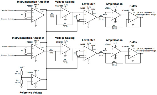 Another circuit has been designed (Figure 16) to provide a measurement of the transient voltage over the WE-RE and CE-RE pairs, respectively. The circuit chain consists of an AD8220 instrumentation amplifier to record the differential voltage, an OPA2188 to apply voltage scaling to reduce the voltage level to within ±1.5 V and an INA826 to level shift the signal to a 1.65 V bias. The final components in the signal chain are the LTC6081 to provide optional amplification and a signal buffer to prevent exceeding the input voltage limitation of the microcontroller’s ADC.
