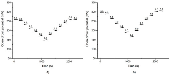 pH series from pH 5.9 to pH 8.5 in steps of 0.5 for an iridium oxide electrode vs. an Ag/AgCl reference electrode. For each pH measurement one minute was taken to swap the pH electrode and give the sensor time to adapt to the new environment, followed by two minutes to measure the sensors response. Measurement using (a) a digital multimeter (Agilent model 34405A) and (b) the custom-made pH readout system.