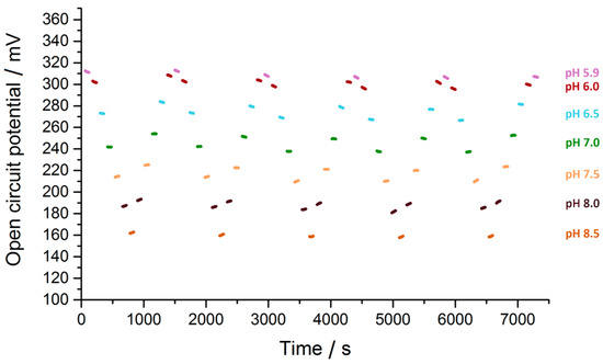 Evaluation of stability and continuity of the sensors was performed applying the same pH level series (Figure 18). Sensor voltages followed the pH value and were reproducible over several cycles whereas hysteresis could be observed depending whether the pH value was increased or decreased, respectively.