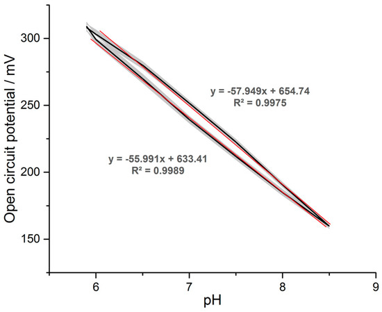 Hysteresis plot of the pH vs. open circuit potential recorded during the stability test. Grey area indicates the standard deviation of the repeated pH series with trend lines. The average Nernstian slope of the pH curve is −57.301 mV/pH.