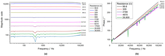 Impedance spectroscopy delivered constant magnitude values over the frequency range (20 Hz to 100 kHz) with test resistors between 99.6 Ω and 38.6 kΩ at increasing amplitudes (Figure 20a) and a linearly increasing phase over the frequency showing slight dispersion (Figure 20b). A resonant behaviour at around 300–500 Hz with resistors below 1 kΩ was observed (Figure 20) in the magnitude spectrum.