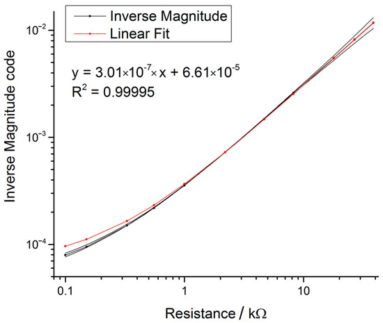 Inverse of the magnitude curve versus resistance showing the linear behaviour of the AD5933. In the range of 1 kΩ to 10 kΩ the system showed best linear behaviour and represented the optimal measurement range of the device setup.