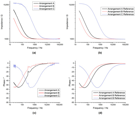 The Bode plot for the arrangements A, B, C recorded with the AD5933 custom system are shown in figures (a,c), while the bode plots for the same arrangements recorded by an Autolab PGSTAT302N impedance module are shown in figures (b,d).