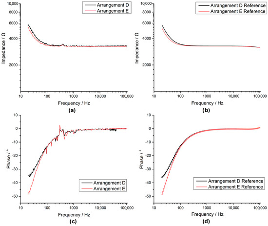 The spectroscopy measurements (50 mV excitation at 20 Hz to 100 kHz) of the custom AD5933 system (Figure 22a,c) were comparable to the commercial reference system (Figure 23b,d) for arrangements A, B and C. This also held true for arrangements D and E (Figure 23) but showing artefact behaviour between 300 and 500 Hz.
