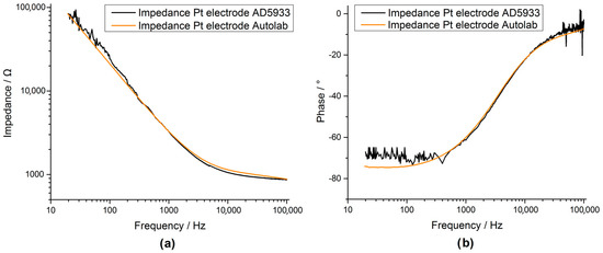 Bode plot of a small platinum electrode with a diameter of 0.85 mm (magnitude (a) and phase (b)). Measurement configured in a three electrode setup. For comparison both the measurement for the custom AD5933 system (black) and the Autolab system (orange) are shown.
