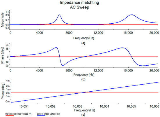 Simulation of an AC sweep across a balanced modified Wheatstone bridge showing (a) magnitude; (b) phase and (c) magnified phase at 10 kHz vs. applied AC frequency.