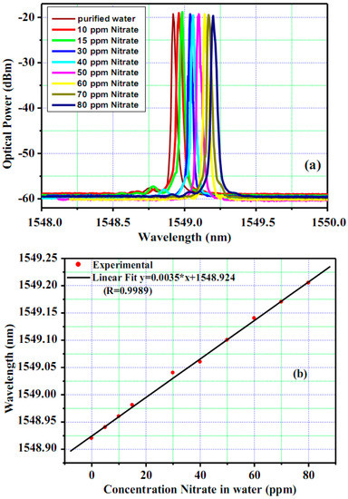 (a) Spectral response for different concentrations of nitrate solutions from fiber laser sensor; and (b) Bragg wavelength shift as a linear function of nitrate concentrations in water.