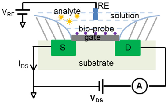 Another method to measure ion concentrations in a solution utilizes ion-sensitive field effect transistors (ISFET). As illustrated in Figure 2, an ISFET operates in a manner similar to a metal-oxide-semiconductor field effect transistors (MOSFET) where the current between source and drain terminals is proportional to the gate voltage that, for an ISFET, is set by reactions during biorecognition events between analytes and bio-recognition immobilized on the gate [30]. ISFET biosensors have been developed for enzyme sensing [31], measuring antigen-antibody bonding reactions [32] and DNA detection [33,34,35]. Immobilization of nanomaterials, such as nanoparticles, nanotubes and nanowires, on the gate has been shown to improve sensitivity [36]. Unlike potentiometric, amperometric and impedimetric biosensors that use an electrode transducer, the ISFET’s transducer is the gate oxide layer. The ISFET response allows the output to be either the gate voltage or source current IDS by fixing one and measuring the other. For example, if IDS is fixed at a value, the gate voltage can be measured using a source follower structure [37]. ISFET output current may be measured by a readout circuit similar to that of an amperometric/impedimetric biosensor. However, it needs more controlled voltages (VRE and VDS) and thus requires a different circuit [38]. The remainder of this paper will focus on biosensors with electrode transducers. For more information on the principles, applications and challenges of ISFET biosensors, the reader is referred to [30,39].