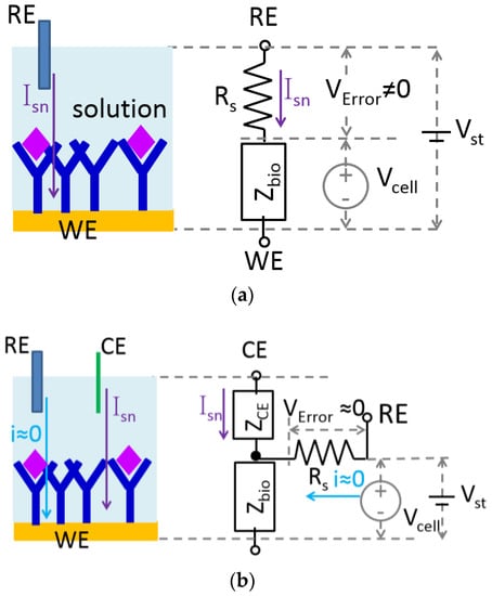 Electrochemical biosensors employ multiple electrodes to translate biorecognition responses into electrical signals. The electrode where electrochemical reactions of interest take place is called the working electrode (WE). The electrode that provides a stable and known potential is called the reference electrodes (RE). The simplest electrode system utilizes only these two electrodes. In such two-electrode systems, a known stimulus voltage, Vst, is applied between RE and WE. The resulting potential across the electrochemical cell’s electrode-electrolyte interface, Vcell, is, ideally, equal to Vst throughout the electrochemical reaction. However, as shown in Figure 3a, in addition to the electrode-electrolyte interface, represented by impedance Zbio, electrochemical cells inherently possess a solution resistance, Rs, representing the ion flow path to RE through the electrolyte solution. The sensing current Isn is supplied by RE. As a result, Vcell is always less than Vst because of the voltage drop, VError, across Rs, which is commonly referred to as the “IR drop” (I = current, R = resistance). Because the IR drop cannot typically be known in advance and can change with environmental conditions, reaction kinetics, etc., it is generally considered to be an undesirable source of noise/error.