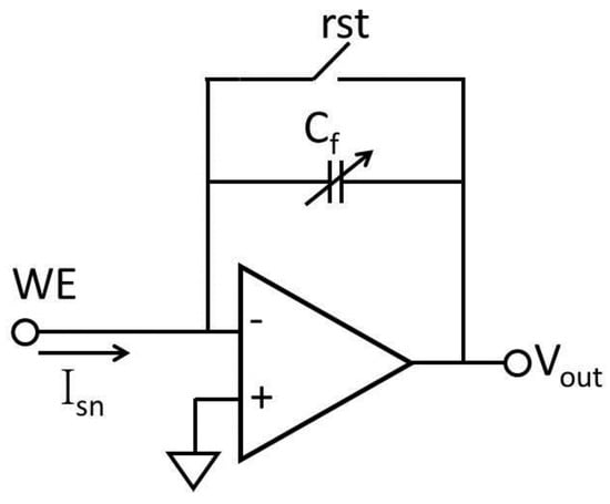 A drawback of resistive feedback is the thermal noise generated by the feedback resistor, which limits readout resolution. To eliminate this noise source, many current readout circuits with capacitive feedback have been introduced [15,56,57,71,73,74,75,76,77]. It has been shown that, in the low bandwidth, capacitive feedback achieves better noise performance than resistive feedback [64]. The basic capacitive feedback structure shown in Figure 8 is an integrating amplifier that converts the input current to a voltage [74]. The biosensor sensing current Isn can be calculated by: